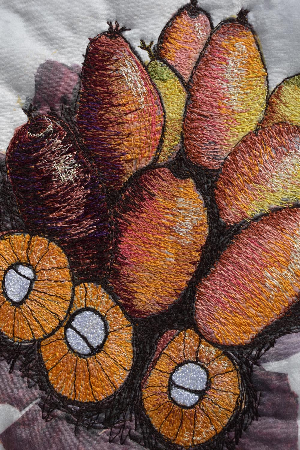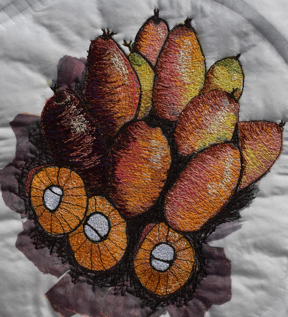 My inspiration comes mainly from organic forms. I have become increasingly interested in Narrative and Still Life. I enjoy the juxta position of forms and colour and the placement of objects in the picture plane. I paint or draw in my sketch book and then manipulate scanned images using Photoshop. The resulting work is printed or painted onto fabric. Texture, detail and colour is added after using free machine embroidery.